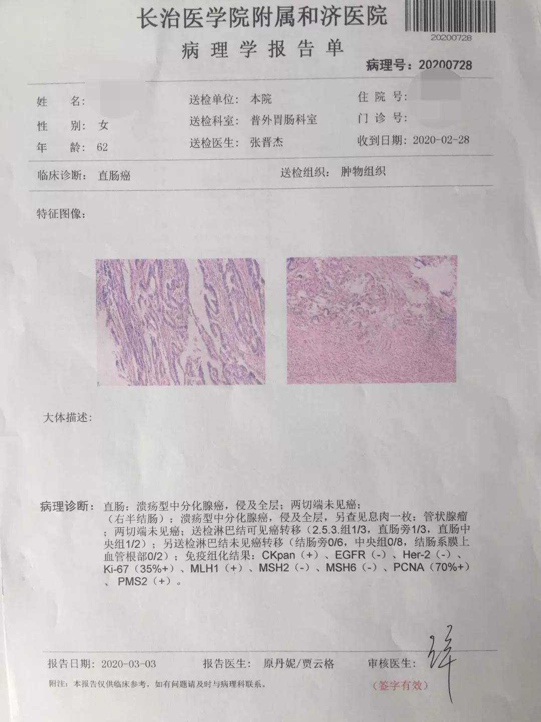 患者李阿姨(化名),62岁,慕名来到医院,毕志彬副主任医师详细询问患者病情,并行相关检查后,诊断为同时性结肠肝曲癌+直肠癌,结肠肝曲肿瘤约4×3cm大小,侵及全层,直肠肿瘤距肛门约7cm,大小约4×4cm,侵及全层。由于患者既往10年前曾行剖腹横结肠癌手术,11年前曾行子宫癌手术,15年前曾行唇癌手术,无疑对手术增加一定的难度及风险。毕主任和手术团队成员针对患者病情经过充分的术前讨论,深度分析病情,明确治疗方案,与患者家属充分沟通后决定为患者行腹腔镜下直肠癌根治术(全直肠系膜切除术total mesorectal excisionTME)加根治性右半结肠切除术。患者由于切口小,术后无明显疼痛,缩短了恢复期,同时也明显缩短了住院时间,在科室医护团队的精心治疗及护理下,康复出院。