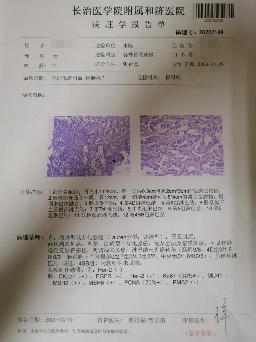 患者王阿姨(化名),今年74岁,入院诊断为同时性胃癌+直肠癌,胃窦部肿瘤约3×2cm大小,侵及肌层,直肠肿瘤距肛门约7cm,大小约5×4cm,侵及全层。术前,毕志彬组织手术团队成员以及麻醉团队共同研究探讨手术方案和应对措施,与家属进行充分沟通后,为患者行腹腔镜下根治性远端胃切除+D2淋巴结清扫+毕Ⅱ加布朗吻合+直肠癌根治术(全直肠系膜切除total mesorectal excisionTME)。目前患者恢复良好,精神状态佳,家属感激不尽,连连称赞毕主任医术精、服务好!