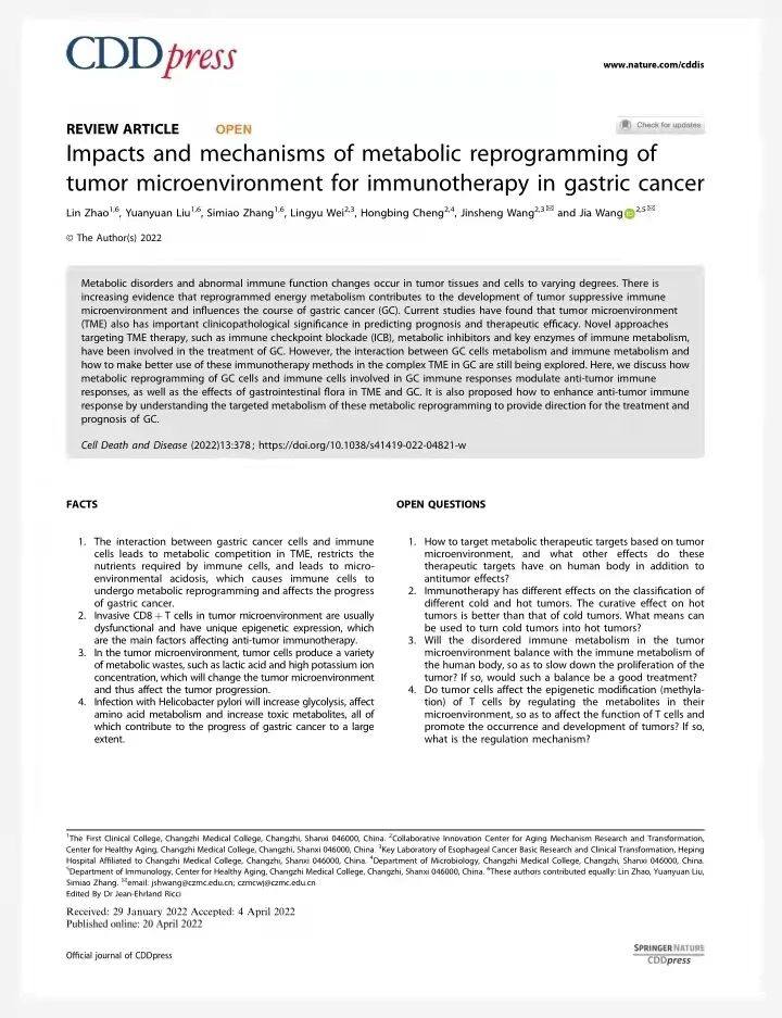 近日,我校第一临床学院2018级教改1802班赵麟、2018级教改1801班刘圆圆和2018级教改1801班张思淼,以共同第一作者的身份在SCI一区杂志cell death and disease,(影响因子9.11)发表了一篇学术研究论文,指导教师为我校党委副书记、校长王金胜教授与基础医学部免疫教研室主任王佳教授。
