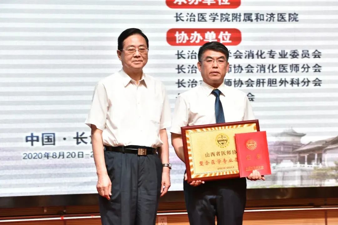李俊峰为山西省医师协会整合医学专业委员会授牌并为王培龙教授颁发主任委员证书。
