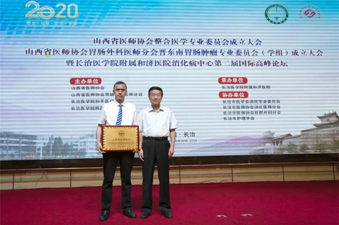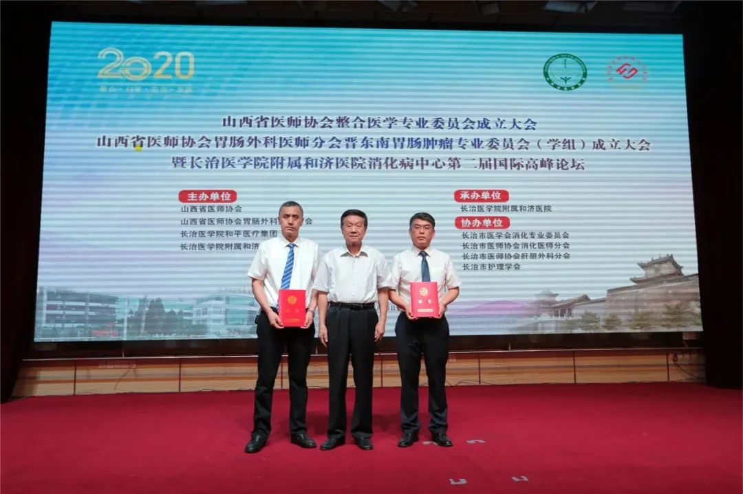 王银全为山西省医师协会胃肠外科医师分会晋东南胃肠肿瘤专业委员会授牌并为郭伟教授颁发主任委员证书,为王培龙教授颁发名誉主任委员证书。