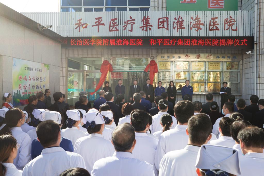 签约仪式结束后,与会领导和相关人员等一同前往两所医院,参加长治医学院附属淮海医院(和平医疗集团淮海医院)、长治医学院附属惠丰医院(和平医疗集团惠丰医院)揭牌仪式。仪式上,工作人员宣读了市卫健委、市人民医院发来的贺信;长治医学院和平医疗集团理事长尚进平发表了热情洋溢的致辞;市政府副秘书长宋海浪、校党委书记李华荣、市卫健委四级调研员桑枫、校长郑建中揭牌。