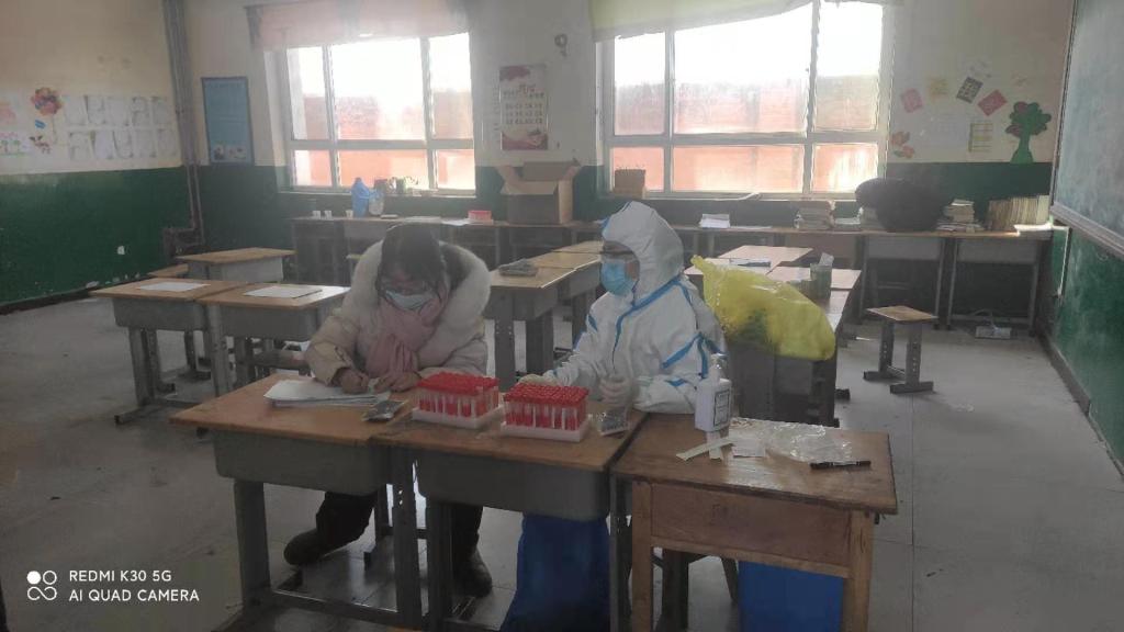 7日清晨我早早就来到检测点,配合着医生进行数据录入。即使天气很冷,也阻挡不住人们对抗新冠病毒的决心,身穿白衣的工作人员逆风而行,不畏严寒与辛劳,争分夺秒地进行着样本采集,守护着身后的父老乡亲、守护着我们的家园。我们村大约有3000多人,对于医生来说,一天完成这么多样本采集是一个挑战,平均每10秒就要完成一位村民的采集。10个核酸检测样本为一组,看着核酸检测的“小刷子”越来越少,管子里的样本越来越多,我有着别样的激动和成就感。