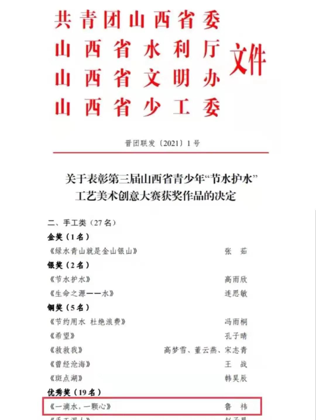 为进一步推进全省广大青少年参与节水护水工作,提高青少年节水护水意识,为青少年提供展现艺术才华的平台。共青团山西省委、山西省水利厅、山西省文明办、山西省教育厅、山西省少工委联合举办了第三届山西省青少年“节水护水”工艺美术创意大赛。