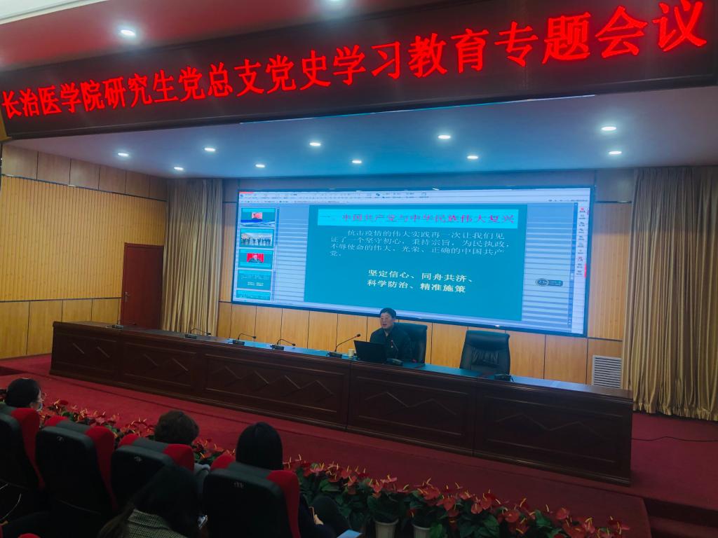 赵中夫教授重点围绕中国共产党与中华民族伟大复兴、青年医学生与中华民族伟大复兴进行了详细阐释。他强调,开展党史学习教育,正是要用党的奋斗历程和伟大成就鼓舞斗志、明确方向,用党的光荣传统和优良作风坚定信念、凝聚力量,用党的实践创造和历史经验启迪智慧、砥砺品格。结合自己的入党初心、工作学习点滴,他激励研究生同学们将个人的理想追求与国家、民族的发展融为一体,坚定理想信念,厚植家国情怀,一步一个脚印,踏踏实实谋发展。