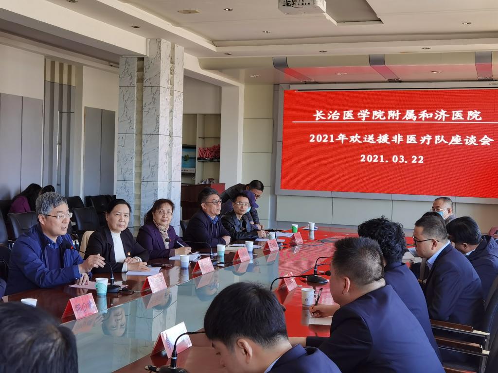 3月22日上午,附属和济医院在七楼会议室召开了2021年欢送援非医疗队座谈会。副校长郑金平、国际合作与交流处副处长王素敏、附属和济医院党政领导、整建制派出的4名援非医疗队员及相关科室负责人参加了座谈会。座谈会由和济医院副院长王培龙主持。