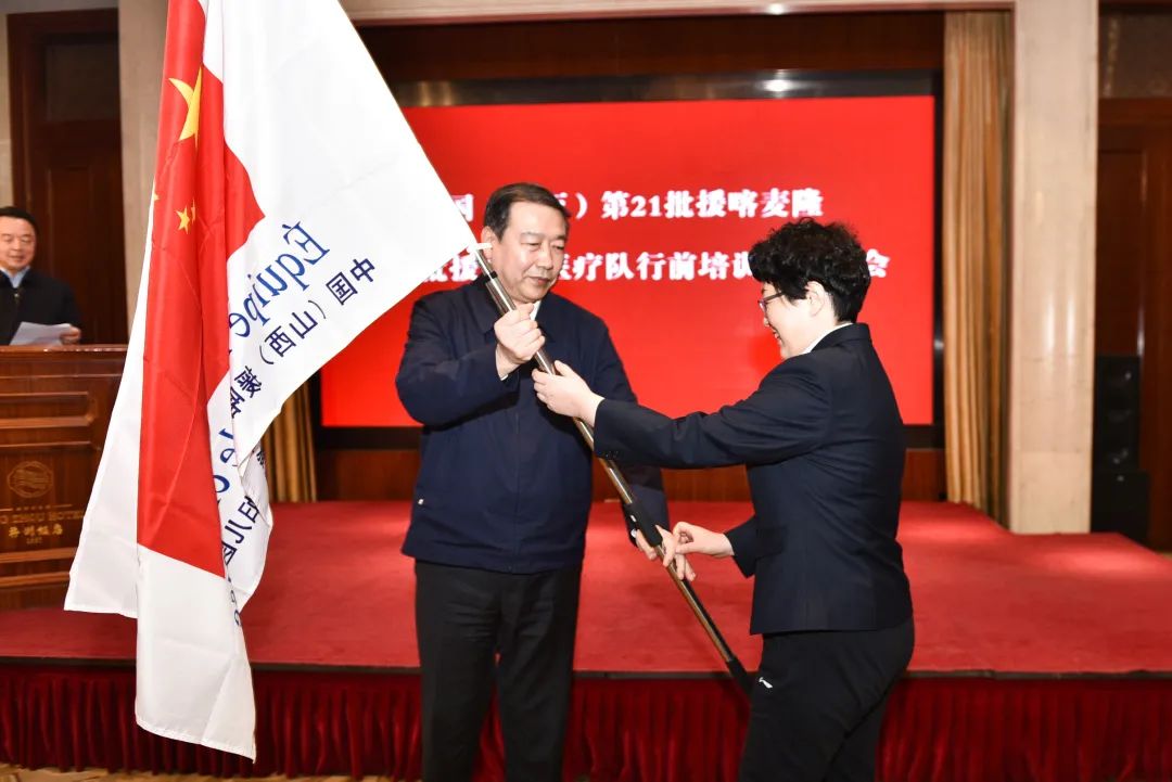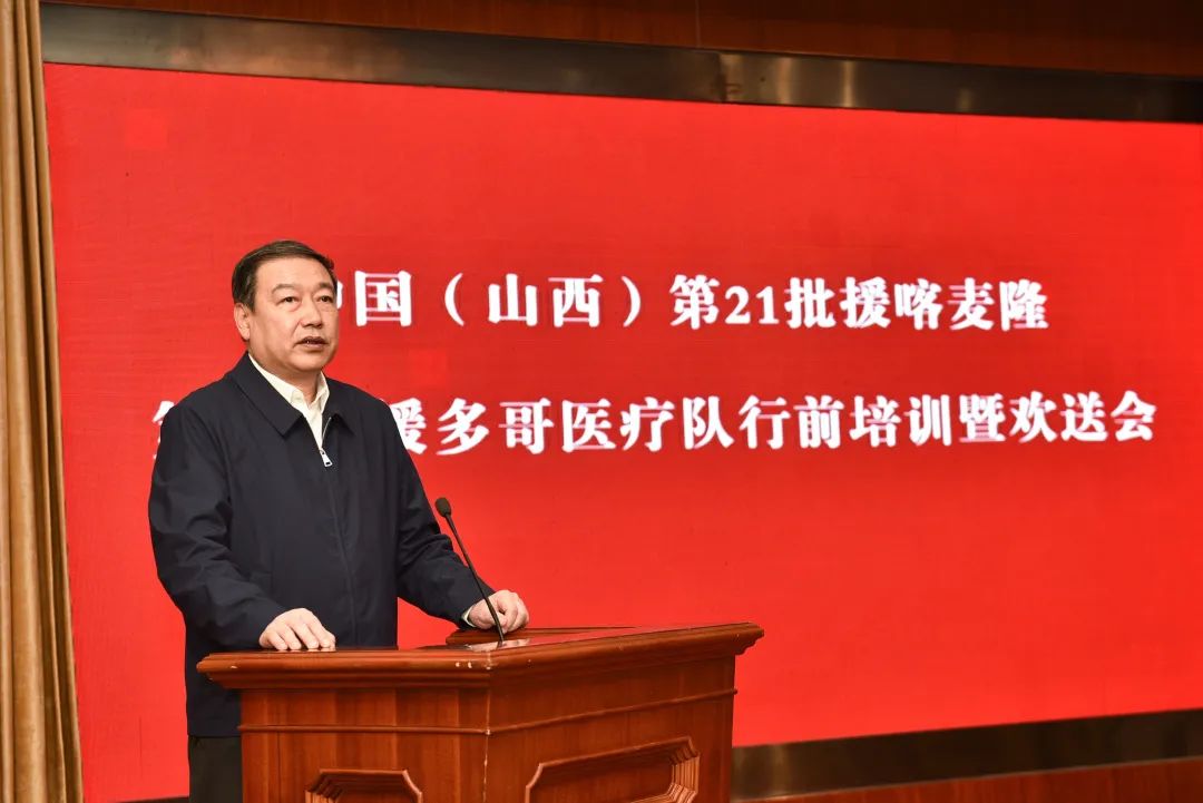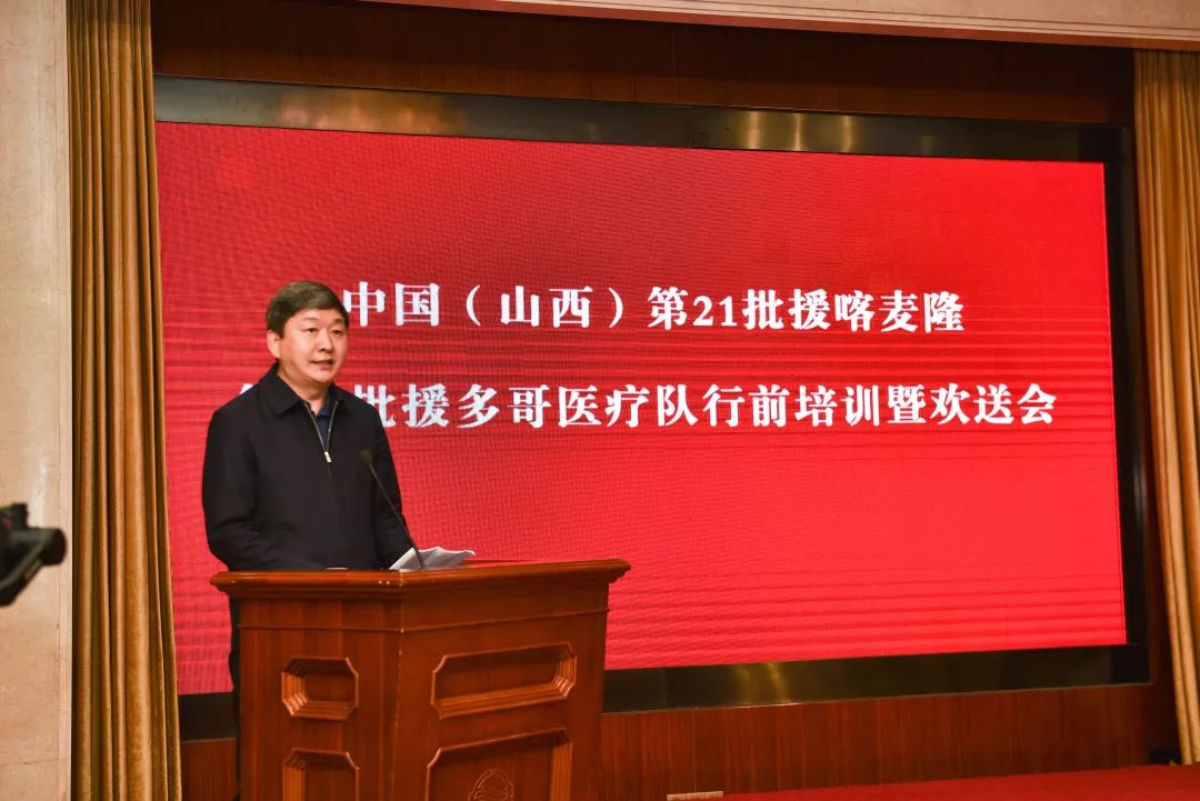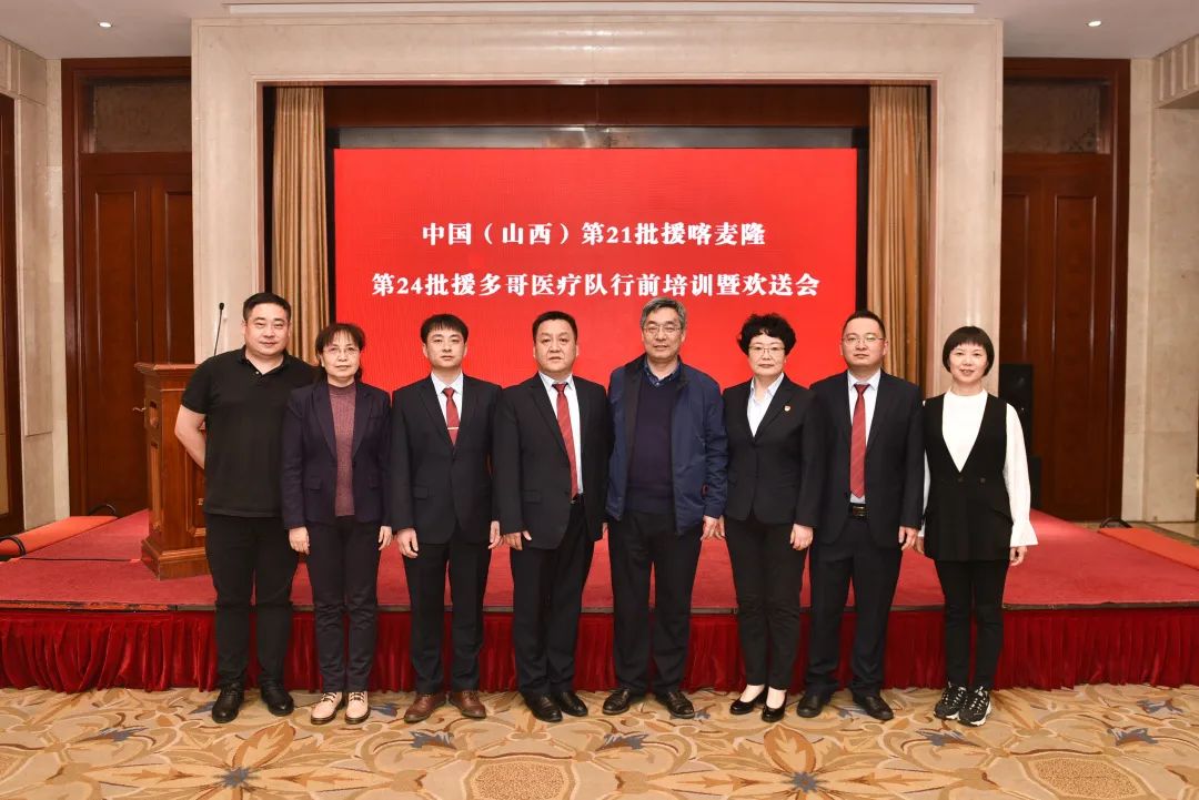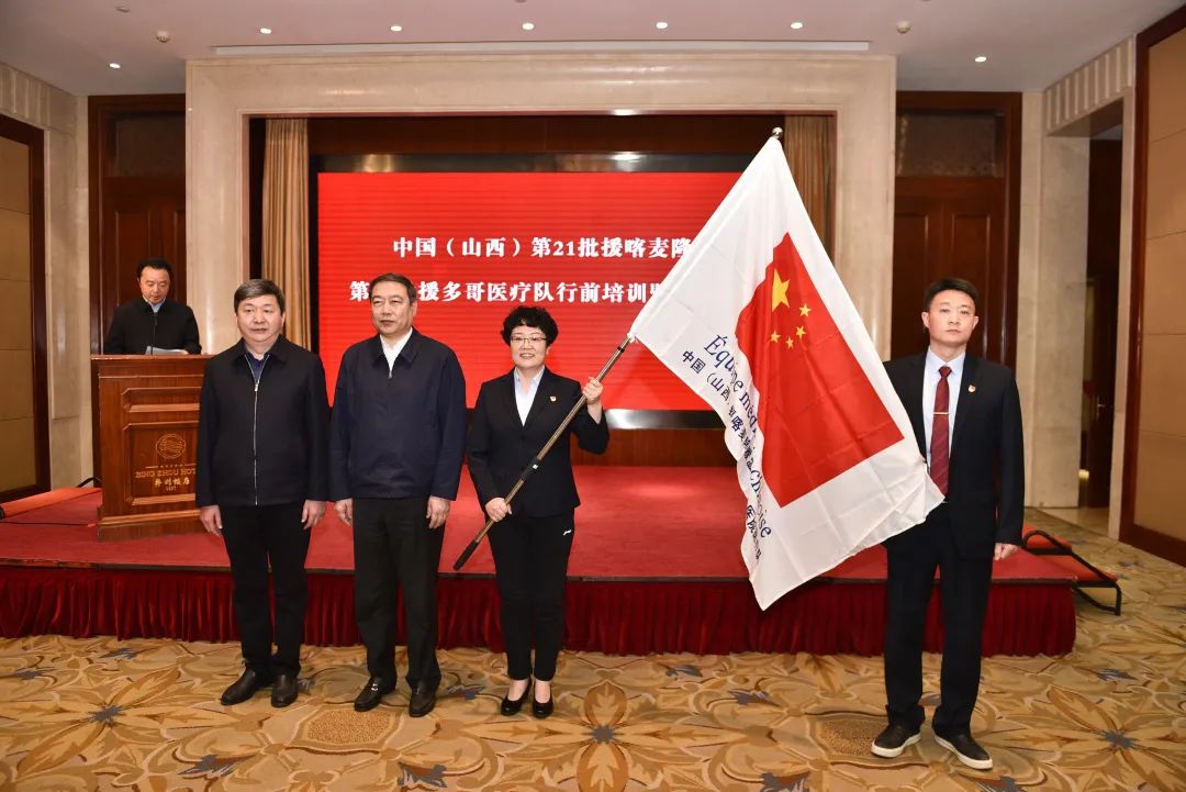 3月24日下午,在太原并州饭店召开第21批援喀麦隆、第24批援多哥医疗队行前培训暨欢送会。山西省卫生健康委员会党组书记、主任武晋希望每位队员发挥所长,注重中西医结合,相互鼓励支持,克服困难,圆满完成工作任务。“也请大家放心,无论你们遇到什么困难,我们是你们坚强的后盾。”随后,向各医疗队队长授出征队旗。