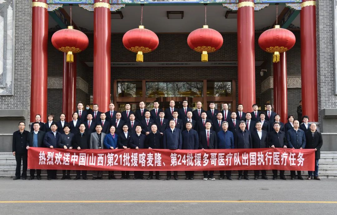 阳春三月花如锦,明媚春光无限好,3月25日,中国(山西)第21批援喀麦隆医疗队启程出征,远赴非洲,执行为期一年的援外医疗任务。校党委常委、副校长郑金平,校国际交流与合作处副处长王素敏,医院院长郝少峰、人事科副科长王彦、医务科副科长马骏前往省城太原送行。