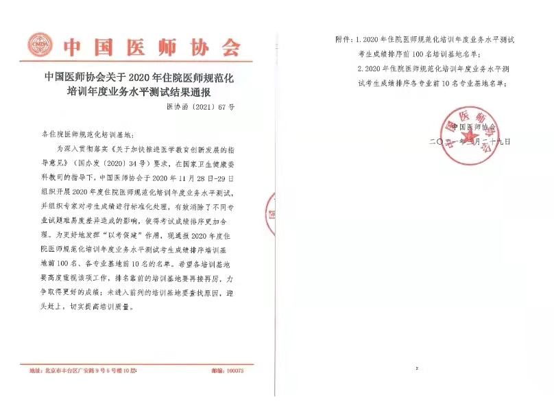 近日,中国医师协会发布《关于2020年住院医师规范化培训年度业务水平测试结果通报》,通报了2020年度住院医师年度业务水平测试考生成绩排序培训基地前100名、各专业基地前10名的名单。我校附属和平医院在全国排名第82;和平医院外科(神经外科方向)专业、超声医学科专业在全国排名第1,外科(泌尿外科方向)专业在全国排名第10。