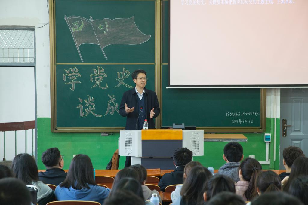 为深入学习贯彻习近平新时代中国特色社会主义思想和党的十九届五中全会精神,扎实推进党史学习教育,切实提升我校师生的理论水平和思想觉悟,2021年4月7日,校党委书记李华荣于北区第五阶梯教室,为对接班级临床1813班和1814、1815班的同学们讲授了以“学党史,谈成长”为主题的教育党课。校党委常委、统战部部长常秀英,第一临床学院综合办公室主任郜国叶、临床1813班思想政治辅导员侯泽宇参加学习。
