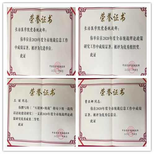 为总结经验,树立典型,推动工作,会议对2020年度全市统战信息调研宣传和实践创新工作中涌现出的先进单位、先进个人和优秀成果予以通报表扬。我校党委统战部荣获“2020年度全市统战信息工作先进单位”“2020年度全市统战理论政策研究工作优秀组织奖”;统战部曹亚娜同志荣获“2020年度全市统战信息工作优秀信息员”;思政部教师王丽撰写的《“互联网+统战”格局下统一战线话语权建设研究》获2020年度全市统战理论政策研究优秀成果二等奖。
