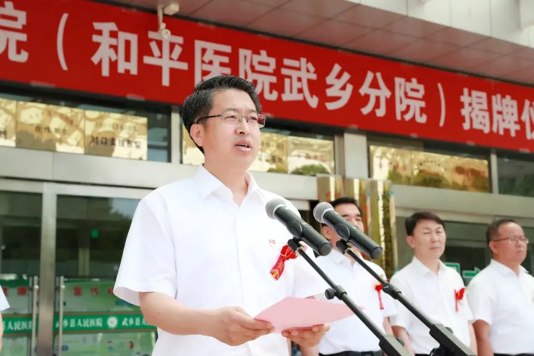 启动仪式上,贺思宇对和平医院专家团队的到来表示热烈欢迎,对我校及附属和平医院为武乡县医疗卫生事业发展所给与的支持表示感谢。他指出,和平医院是晋东南地区久负盛名的一所综合性三级甲等医院,同时也是一所具有悠久革命历史的红色医院。希望武乡县人民医院充分利用本次合作建院机会,不断加强与和平医院的交流与合作,依托和平医院强大的医疗帮扶力量,提高县医院医疗技术和创新能力,培养高层次人才,推动县医院医疗技术、服务质量再上新台阶,为广大人民群众提供更加高效、优质、便捷的医疗服务。今后,还要不断深化与和平医院在人才培养、技术支持、医疗管理等方面的合作,为武乡县卫生健康事业高质量发展作出新的更大贡献。