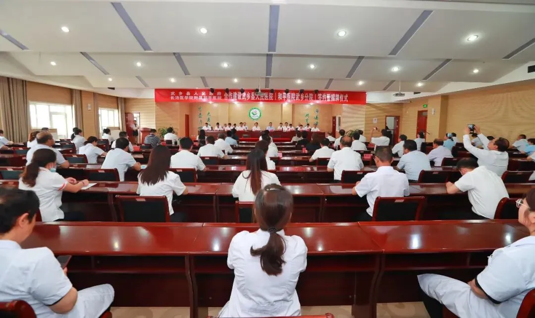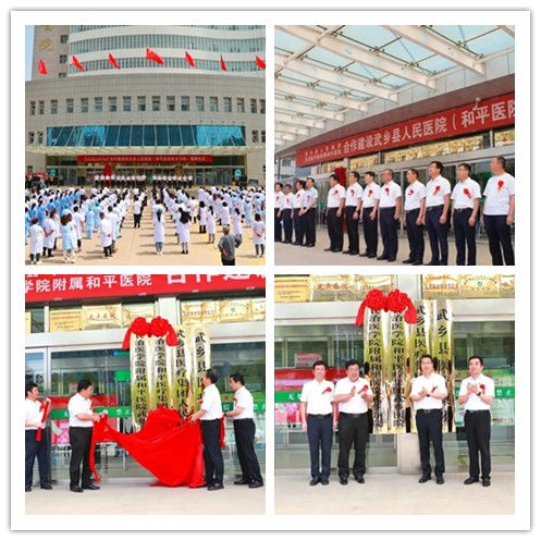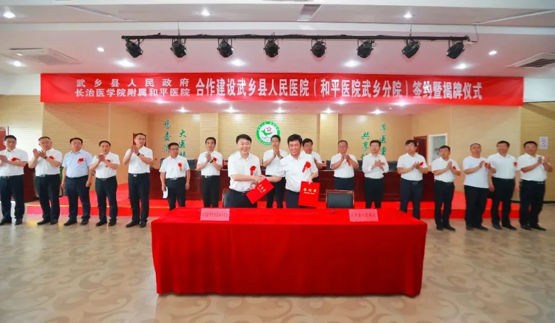 为了响应国家《关于推动公立医院高质量发展的意见》政策号召,促进附属和平医院全面融入地方区域社会,推动优质医疗资源下沉,切实解决老区群众“看病难、看病贵”问题。6月11日,武乡县人民政府和附属和平医院签约合作启动仪式暨和平医院武乡分院揭牌仪式在武乡县人民医院举行。我校党委书记李华荣,党委常委、副校长王金胜;附属和平医院党委书记尚进平,党委副书记、院长李红倬;武乡县委书记贺思宇、县长王书文等有关领导出席参加。