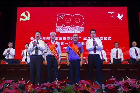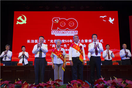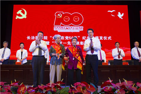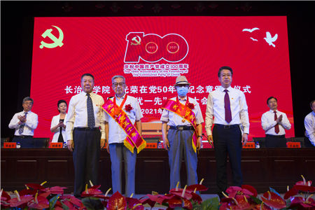 颁发“光荣在党50年”纪念章是中国共产党成立100周年庆祝活动的重要内容。我校颁发仪式现场气氛庄重而热烈,在昂扬的音乐声中,李华荣、郑建中为光荣在党50年老党员们颁发纪念章并一一握手致意。