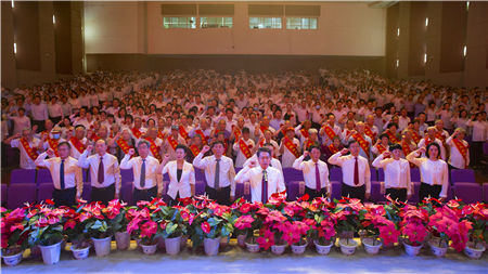 党委书记李华荣同志领誓,全体党员举起右拳重温入党誓词。
