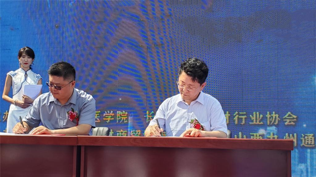 座谈会后,宋晓亮代表我校与山西上党中药材商贸城有限公司签署了校企合作框架协议,并为长治医学院实践教学基地揭牌。上党中药材商贸有限公司总经理刘慧、山西九州通医药有限公司董事长王亚雄、山西振东道地药材开发有限公司总经理张建峰等入驻商贸城的企业代表参加了座谈会和揭牌仪式。