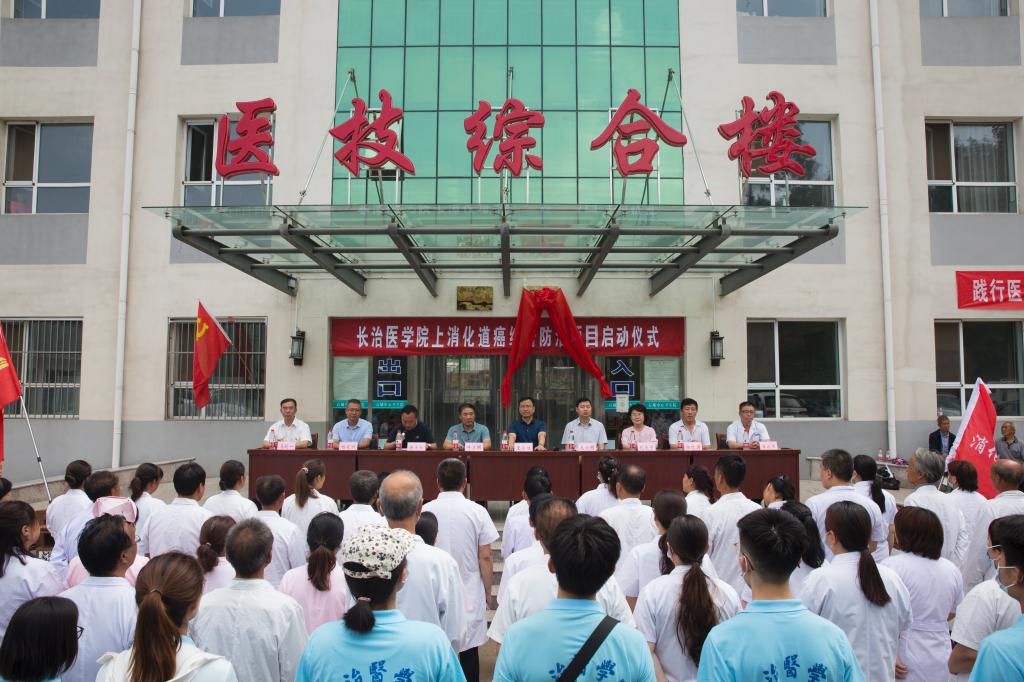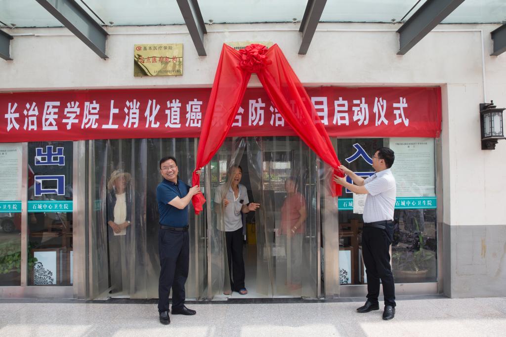 7月16日上午,“长治医学院上消化道癌综合防治项目”启动仪式暨山西省卫生健康委员会“食管癌基础研究与临床转化重点实验室研究”现场基地揭牌仪式在平顺县石城镇中心卫生院举行。副校长王金胜、医院管理处处长牛庆国、医学检验学系主任纪爱芳、科技处副处长杨建洲、平顺县副县长赵钦国、卫体局局长陈茂松、县医疗集团总院院长杨红勇、石城镇党委书记马跃一、石城镇中心卫生院院长崔小伟,项目组全体成员,石城中心卫生院全体医护人员、石城镇所辖各村全体村医及当地居民近百人出席仪式。
