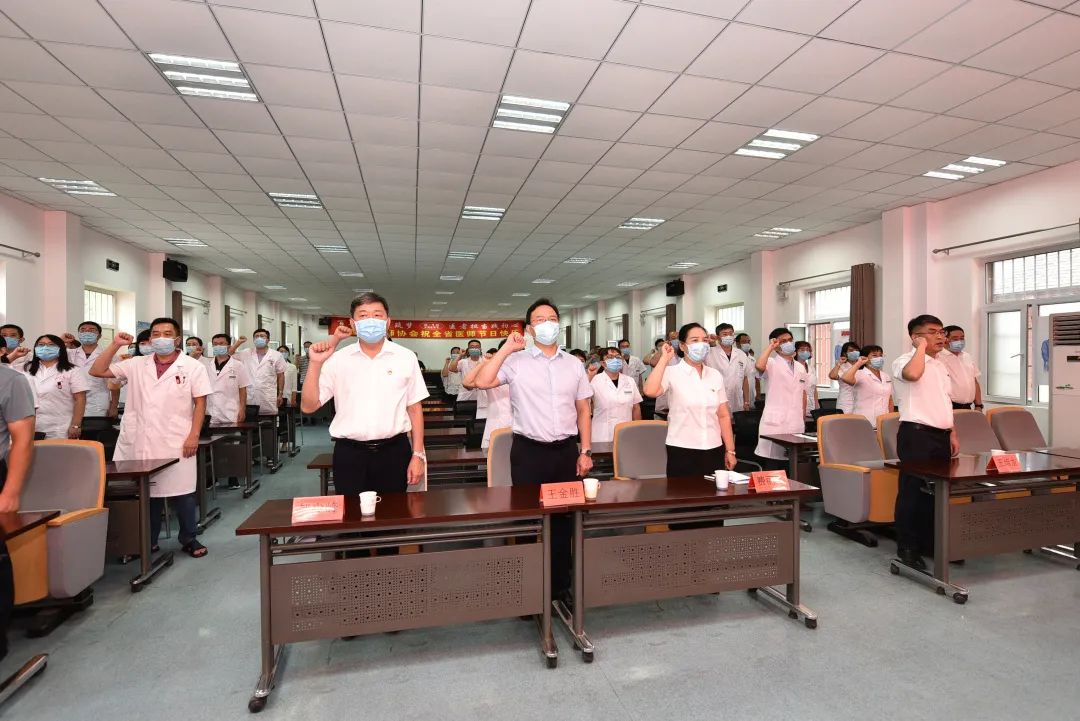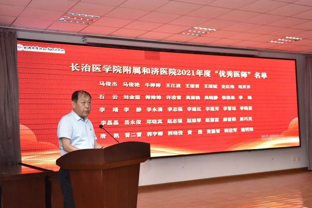 大医精诚,仁心仁术。在第四个中国医师节来临之际,为表彰先进典型,汲取榜样力量,增强医疗工作者的职业荣誉感、自豪感和归属感,突出“百年华诞同筑梦,医者担当践初心”的主题。8月19日下午,附属和济医院在多功能会议室召开庆祝第四个中国医师节暨表彰大会。长治医学院党委副书记、校长王金胜,医院管理处处长牛庆国,附属和济医院领导出席会议。医院各党支部书记、各科室主任以及优秀医师代表参加会议。会议由医院党委副书记、副院长王培龙主持。