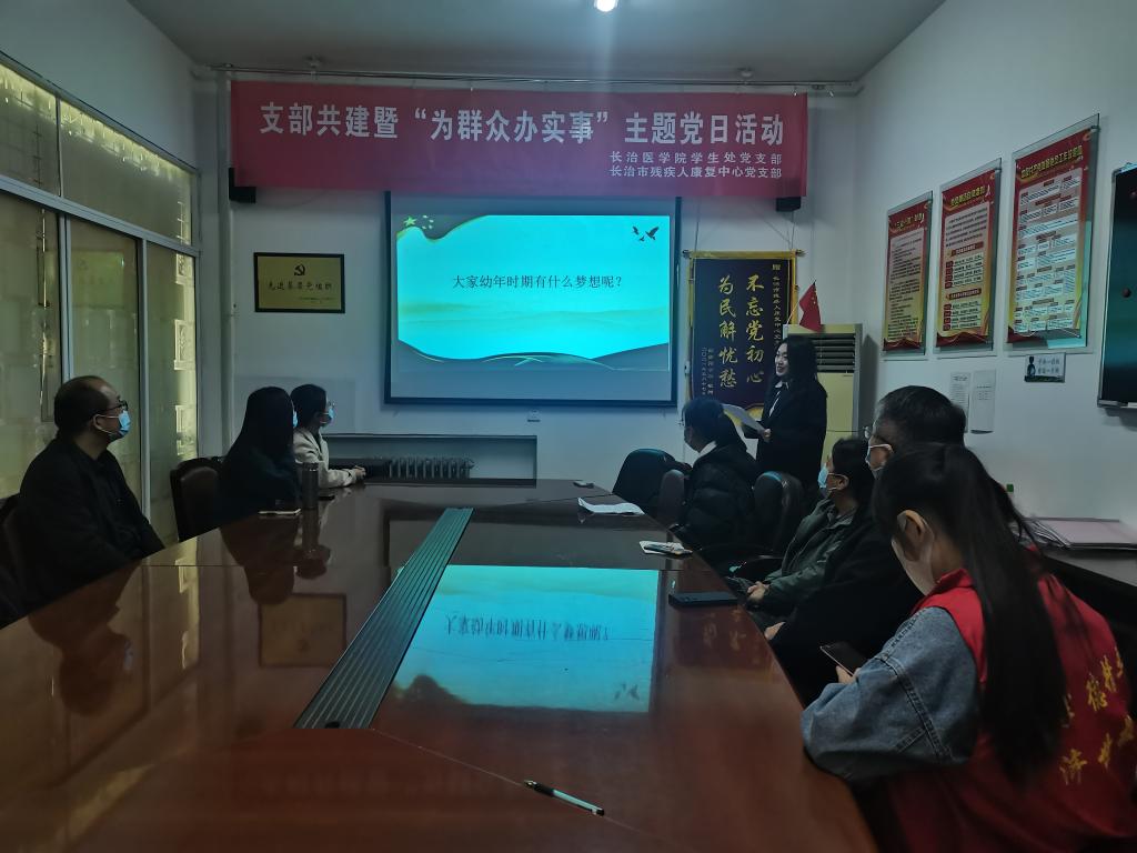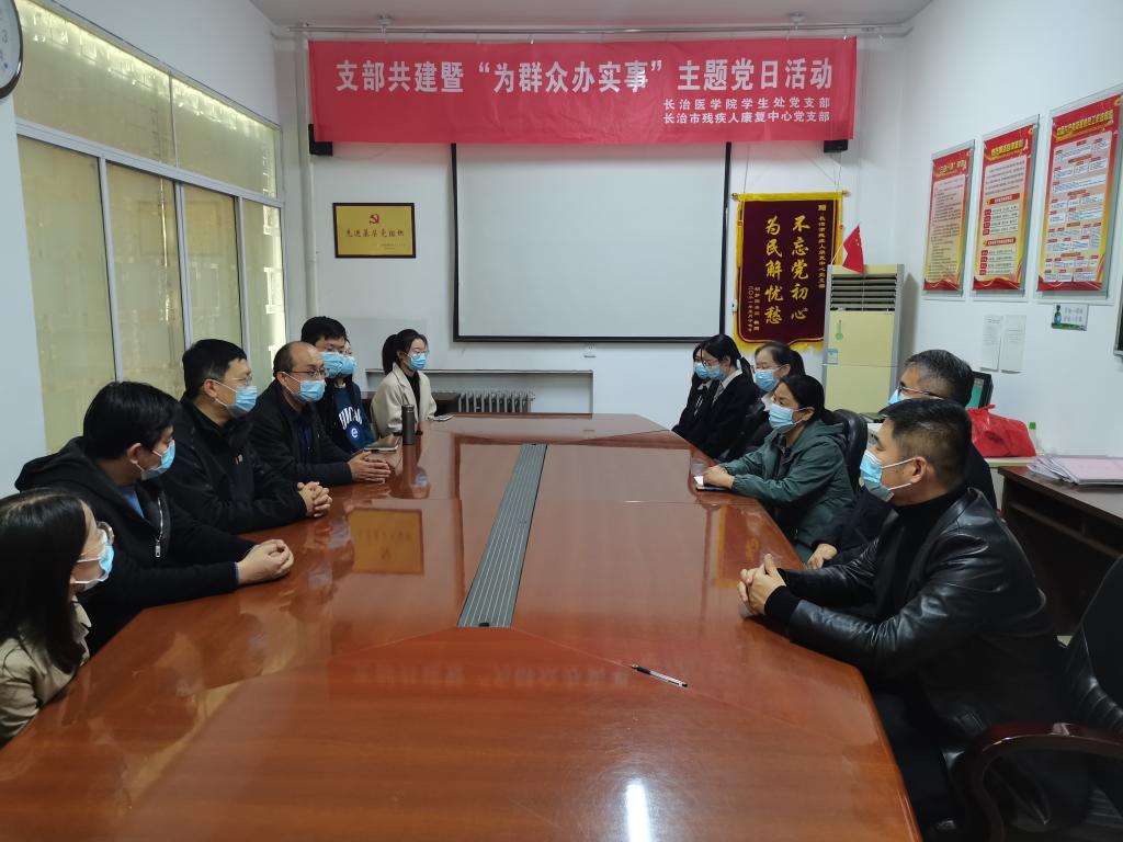 为强化提升党支部政治功能和组织力,搭建党支部交流共建平台,10月28日下午,学生处党支部与长治市残疾人康复中心党支部开展了党支部共建活动。学生处党支部书记裴振、长治市残疾人康复中心党支部书记杨玉、两个支部的党员以及我校20余名大学生志愿者参加活动。