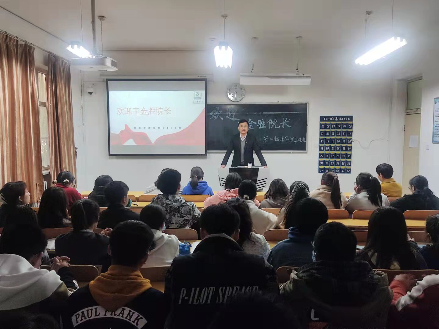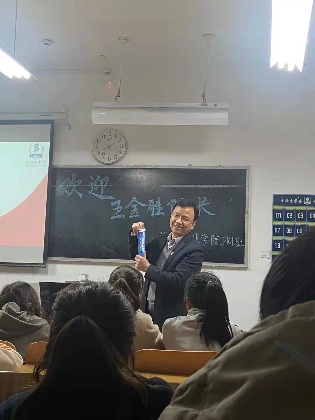 为帮助同学们树立正确的人生观和价值观,落实立德树人的根本任务,促进学生德智体美劳全面发展。10月27日上午,党委副书记、校长王金胜在北区46教与所联系班级第二临床学院2101班同学见面座谈。见面座谈会由辅导员刘健老师主持。