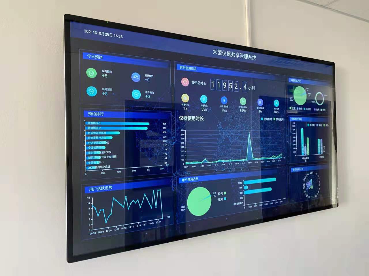 该平台以现代信息技术为依托,集中管理仪器设备,实现了实验室门禁控制与大型仪器共享管理系统无缝联动,支持刷卡扫码、刷脸上机/下机等功能,仪器使用情况可通过大屏显示系统对数据信息抓取、汇总、实时展示。该平台集查询、预约、统计、展示、发布功能于一体,课题组用户可根据自己的需要在线多终端查询或搜索仪器位置、状态等信息并选择时间段进行预约,受到师生好评。在系统测试运行阶段,中心实验室广泛听取师生意见建议,不断改进系统设置,人性化设置功能模块,优化了手机客户端APP、二维码扫描、人脸识别、扫码刷卡开机等模块,建设并完善了实验室网站建设以及有关规章制度和系列操作手册,多途径尽最大可能为师生预约使用实验室和仪器设备提供便利。近日,中心实验室还组织开展了数场关于大型仪器设备共享管理平台上线试运行的现场培训,帮助师生进一步熟悉预约流程及使用。自系统测试运行几个月以来,中心实验室已为不同课题组63人次提供预约服务,仪器设备累计预约909台次,累计运行机时超过1.24万小时。
