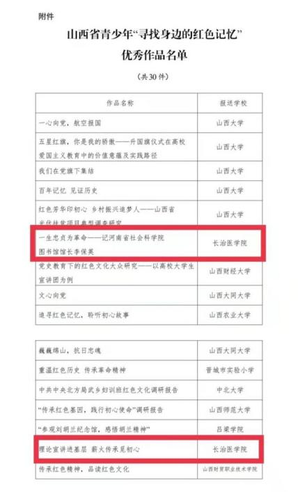 近日,从团省委下发的晋团联发〔2021〕23 号《关于公布山西省青少年“寻找身边的红色记忆”优秀作品的通知》中获悉,我校“奋斗百年正芳华 红心向党好青春”社会实践团作品“一生忠贞为革命——记河南省社会科学院图书馆馆长李保英”、青马工程理论宣讲实践团作品“理论宣讲进基层 薪火传承觅初心”从众多作品中脱颖而出,荣获“优秀作品”荣誉。