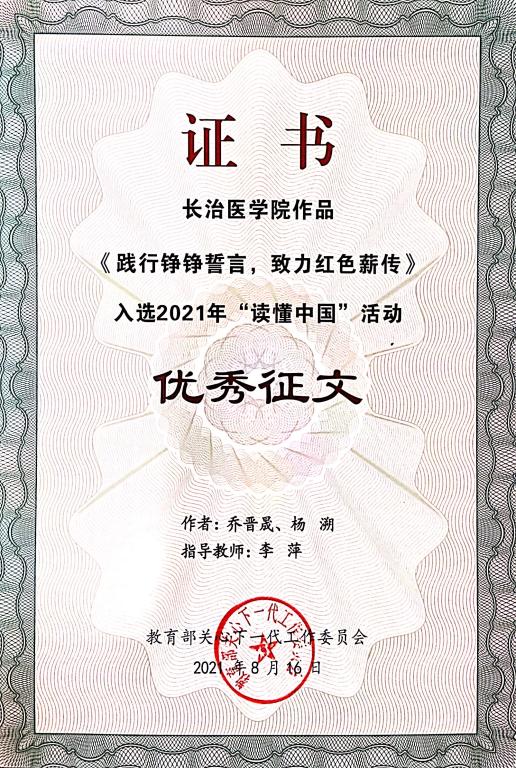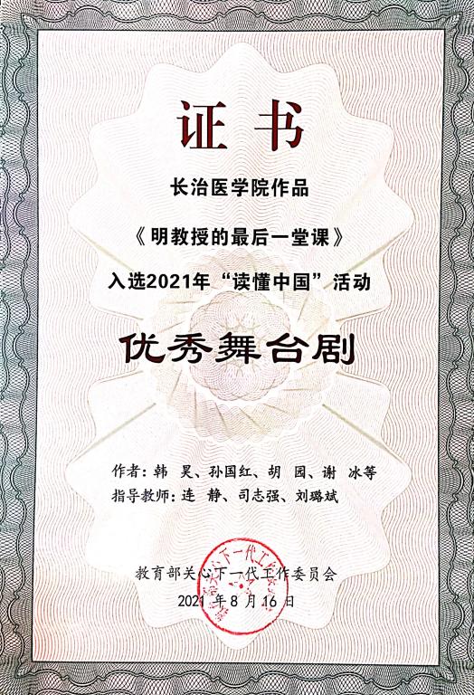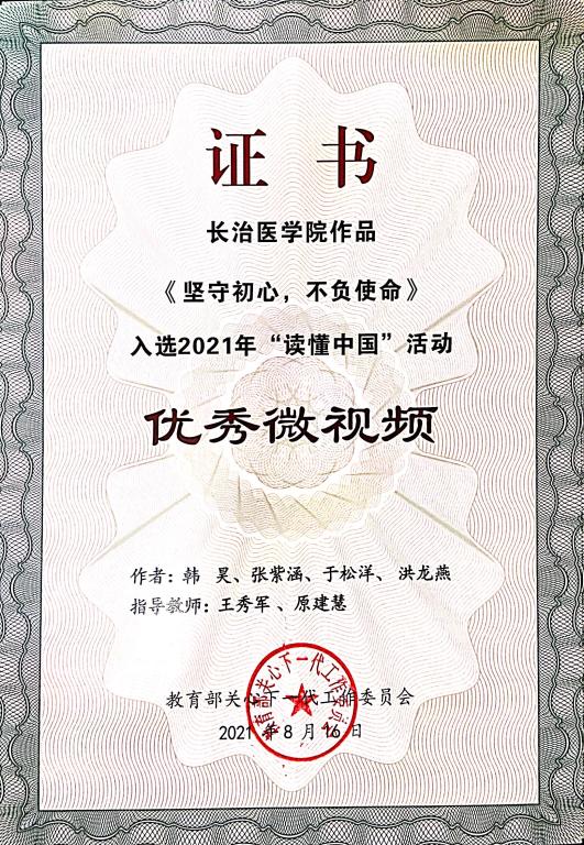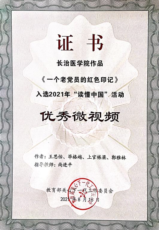 近日,从教育部关工委下发的教关委函〔2021〕10号《关于公布2021年“读懂中国”活动评审结果的通知》中获悉,山西省共有5个作品获得优秀奖,我校关工委选报并经山西省教育厅关工委评选推送的4个作品均在获奖之列。其中研究生党总支撰写的记优秀“五老”赵中夫教授《践行铮铮誓言、致力红色薪传》获“优秀征文”;第一临床学院党总支制作的记优秀“五老”陈鹤祥教授《一个老党员的红色印记》和公共卫生与预防医学系党总支制作的记优秀“五老”冯向先教授《坚守初心、不负使命》获“优秀微视频”;校团委制作的记优秀“五老”明纪堂教授《明教授的最后一堂课》获“优秀舞台剧”。同时,在本次“读懂中国”活动中我校关工委荣获优秀组织奖。
