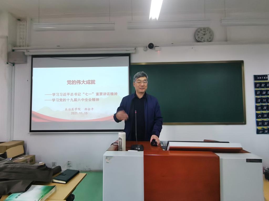 为进一步推进党史学习教育,11月15日上午,党委常委、副校长郑金平为健康管理系、教辅党总支师生讲授了题为“党的伟大成就——学习习近平总书记‘七一’重要讲话精神、党的十九届六中全会精神”的专题党课。教辅党总支教职工党员、健康管理系党总支教职工党员及学生代表到场聆听党课。