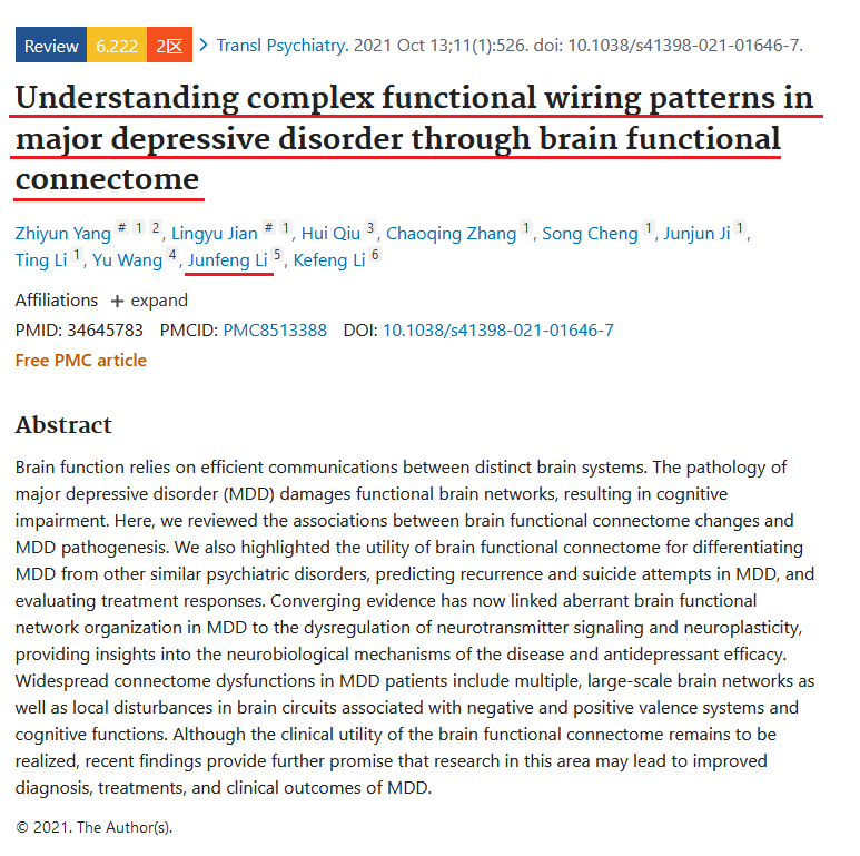 近日,医学影像学系李俊峰教授科研团队在国际权威的专业精神病学杂志Translational Psychiatry(IF:6.222)上在线发表题为“Understanding complex functional wiring patterns in major depressive disorder through brain functional connectome” 的论文。今年该团队累计发表SCI论文两篇,IF合计15.842。