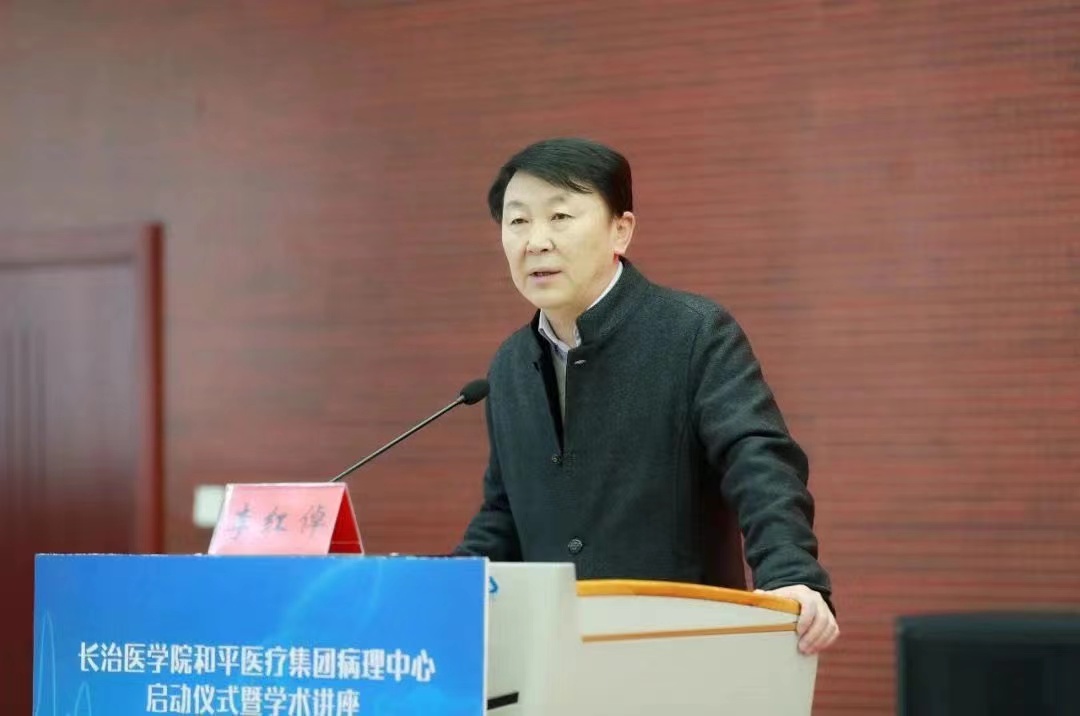 会上,附属和平医院院长李红倬宣读了关于成立长治医学院和平医疗集团病理中心的通知。和平医院病理科特聘主任任宏政介绍了和平医疗集团病理中心成立的背景、使命、现状和未来。播放了美国病理专家及全国各地病理界对病理中心成立的祝贺视频,山西省肿瘤医院病理科主任、山西省医学会病理学分会主任委员郗彦凤为病理中心成立致贺词。