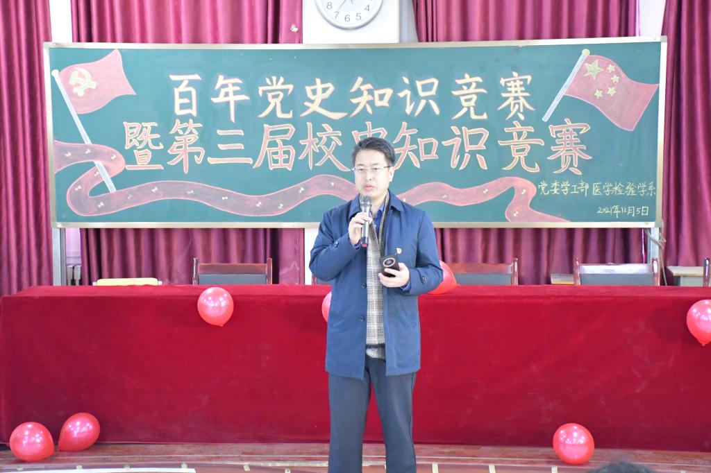 为引导青年学生传承红色基因,赓续红色血脉,坚定“四个自信”,增强爱国荣校的责任感,12月5日党委学工部和医学检验学系在五龙校区共同举办了“铭记长医红色史,青春向党勇担当”百年党史知识竞赛暨第三届校史知识竞赛。校党委书记李华荣,副校长李长江,党委学工部部长邢育宏、副部长裴振和医学检验学系党政领导、教师、学生代表一同观看比赛。