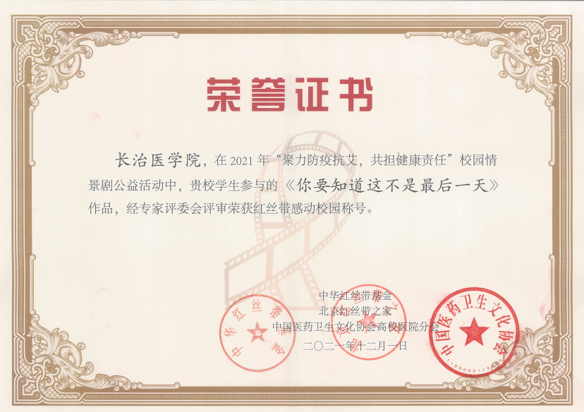 近日,在中华红丝带基金、北京红丝带之家、中国医药卫生文化协会高校医院分会联合主办的2021年“聚力防疫抗艾,共担健康责任”校园情景剧公益活动中,我校选送的防艾情景剧作品《你要知道这不是最后一天》荣获“红丝带感动校园”称号。