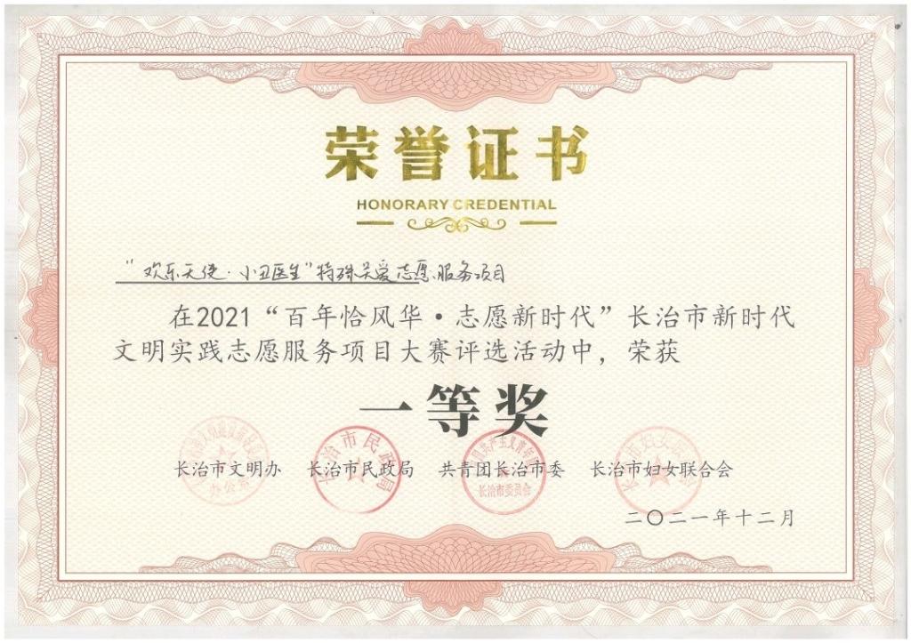 近日,由长治市文明办、长治市民政局、共青团长治市委、长治市妇女联合会共同举办的2021年“百年恰风华·志愿新时代”长治市新时代文明实践志愿服务项目大赛评选活动中,我校“欢乐天使,小丑医生”特殊关爱志愿项目从150个志愿项目中脱颖而出,荣获一等奖,并获得奖金3000元。