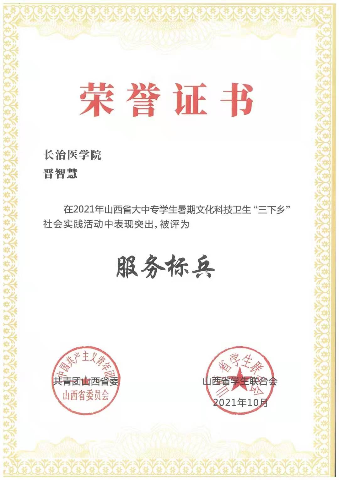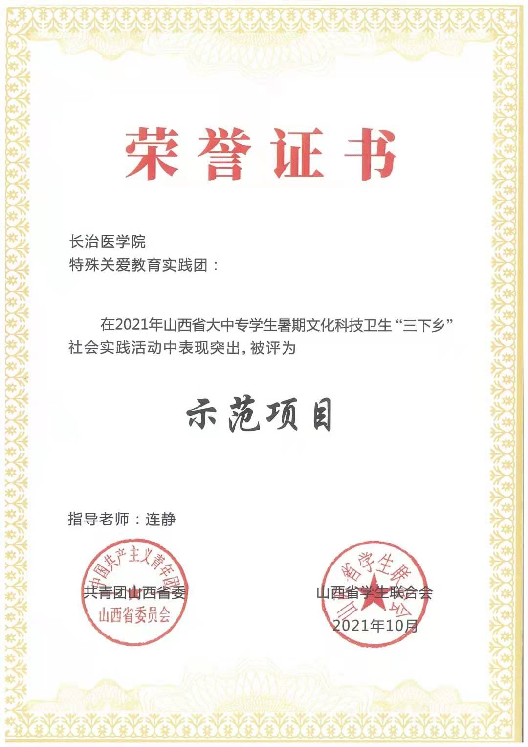 近日,团中央和团省委、省学联先后对2021年全国、全省大学生暑期“三下乡”社会实践活动中表现突出的集体、个人及社会实践成果进行了通报表彰,我校喜获2项国家级表彰、2项省级表彰。在团中央的表彰中,我校团委荣获2021年“投身乡村振兴,助力健康中国”全国大学生暑期社会实践专项活动“优秀组织单位”荣誉、校团委副书记连静荣获“优秀指导教师”荣誉;在团省委、省学联的表彰中,我校特殊关爱教育实践团荣获2021年山西省大中专学生暑期文化科技卫生“三下乡”社会实践活动“示范项目”荣誉;精神卫生系1801班晋智慧荣获2021年山西省大中专学生暑期文化科技卫生“三下乡”社会实践活动“服务标兵”称号。此外,在中国大学生在线主办的“2021暑期社会实践成果征集展示活动”中,我校青马工程理论宣讲实践团“薪火传承促公卫 理论宣讲再出发”荣获“乡村振兴十佳社会实践团队”称号。