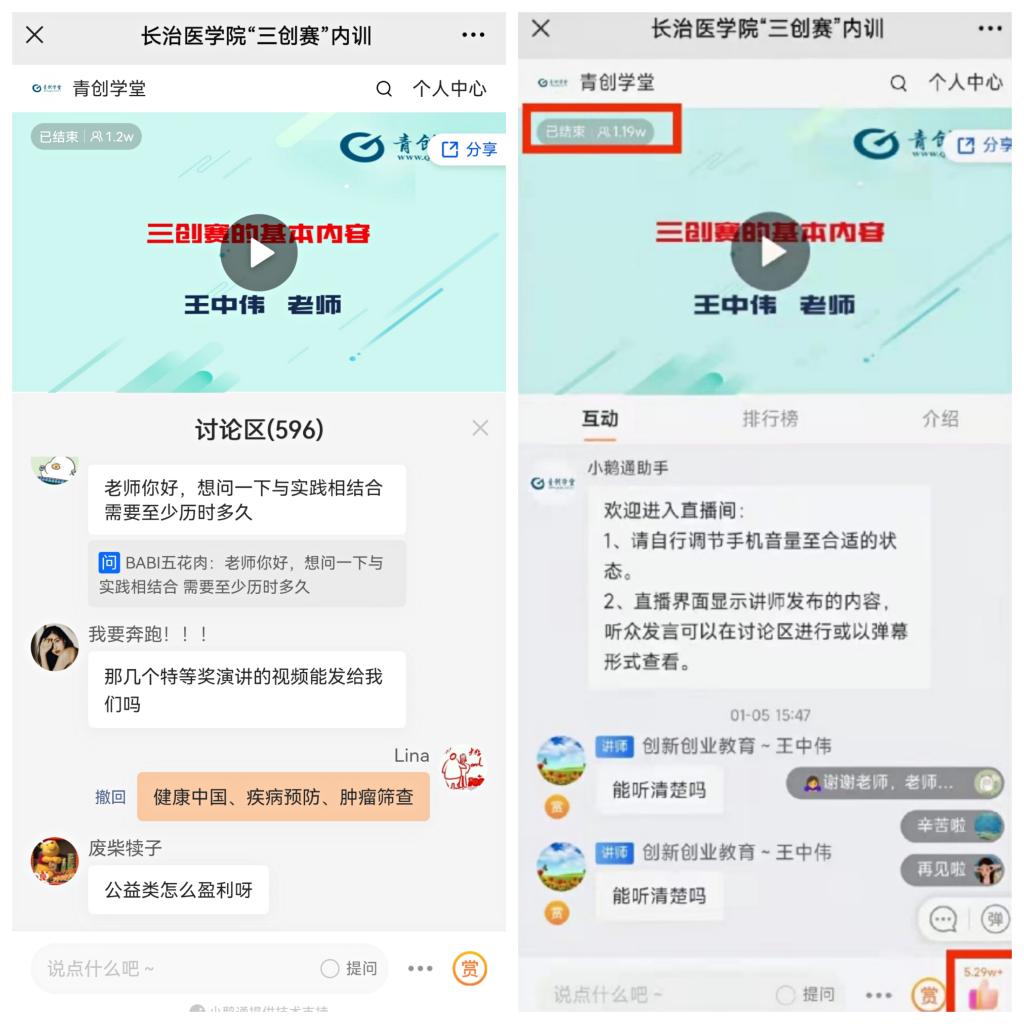 全国大学生电子商务创新、创意及创业挑战赛,是我校首次加盟参与的双创类大赛。本次内训直播讲座累计参与人数达到1.19万人次,点赞数高达5.29万,反响热烈,不仅加深了同学们对三创赛的了解,还为同学们提供了参赛中可能遇到问题的解决方案,帮助同学们理清参赛思路,极大地提高了同学们的参赛积极性。校团委成立“双创教育与大学生创新创业类大赛指导工作坊”,将持续邀请国家知名双创导师、大学生创新创业大赛评委、国家级双创项目负责人和指导老师,通过线下讲座、线上直播和微信群互动的方式,围绕常态化双创教育、双创类赛事和项目落地等进行分享,对开展创新教育和实践教学改革、加强产学研之间联系发挥了积极作用。
