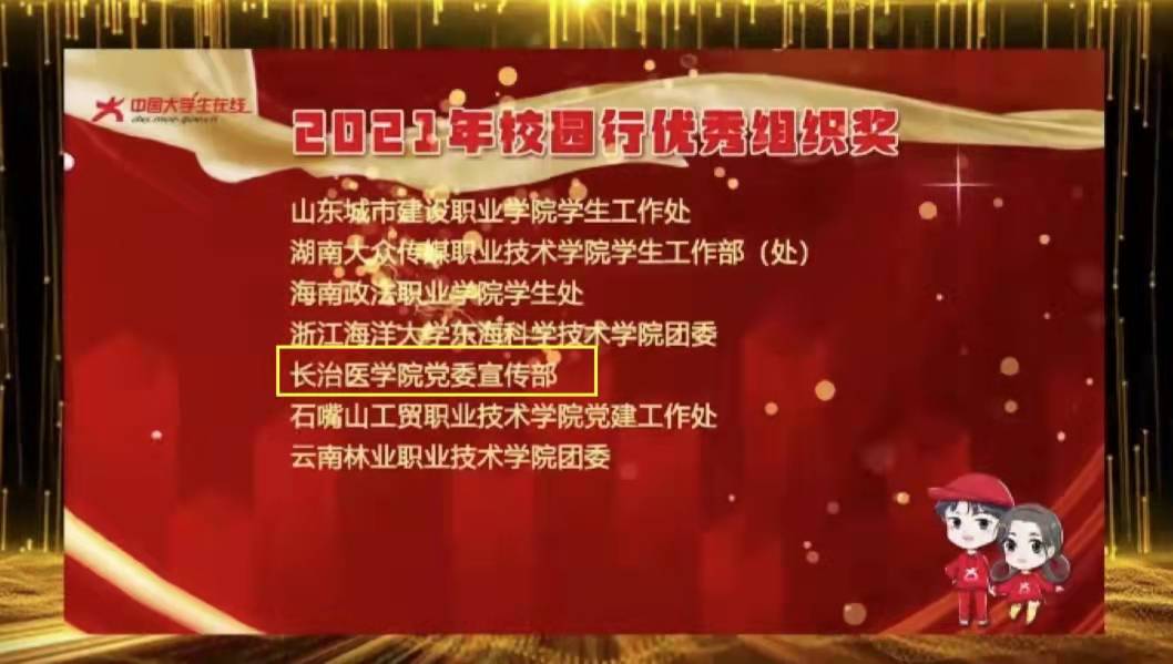 日前,我校党委宣传部在2021年中国大学生在线校园行活动中,成绩显著,被授予“2021年校园行优秀组织奖”荣誉称号。
