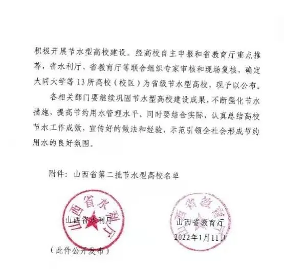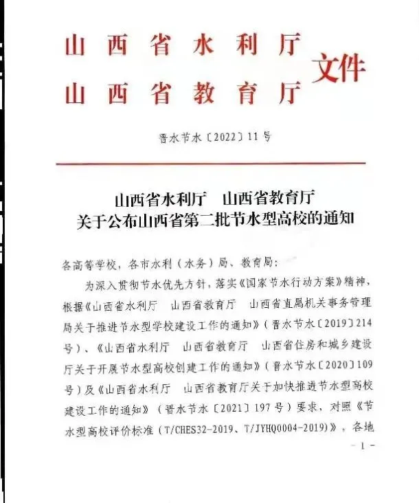 日前,山西省水利厅、山西省教育厅联合发布《关于公布山西省第二批节水型高校的通知》,我校获评“山西省第二批节水型高校”称号。