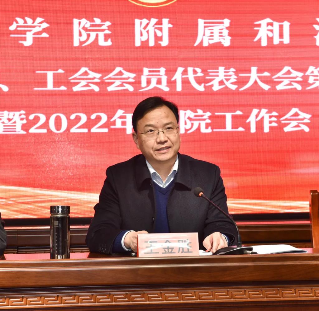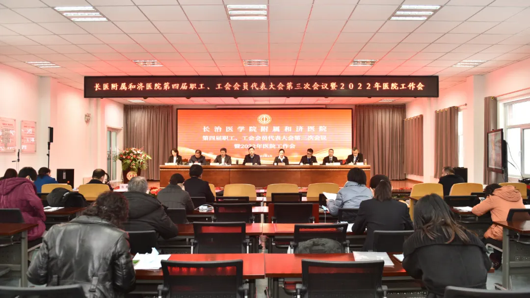 2022年1月21日至22日,附属和济医院举行第四届职工、工会会员代表大会第三次会议暨2022年医院工作会,会议在庄严的《国歌》声中拉开序幕。校党委副书记、校长王金胜出席会议并作重要讲话。医院党政领导班子成员费丽萍、郝少峰、王培龙、郭志宏、王向东、牛晓红、郭伟以及医院职工、工会会员代表、列席人员参加会议,共商医院发展大计,共绘医院发展蓝图。根据疫情防控工作要求,本次会议采取线上线下同步视频转播,共设一个主会场,两个分会场。