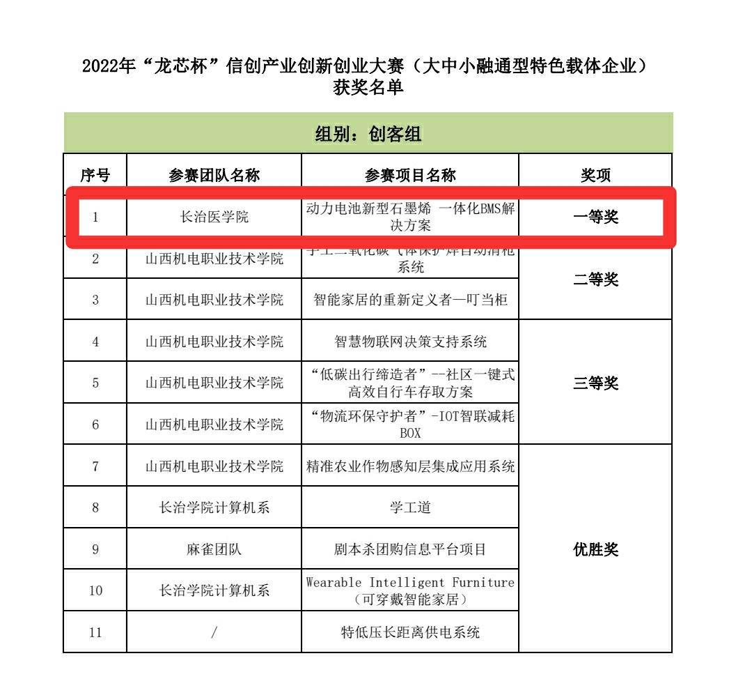 3月9日,在长治市高新区人才服务中心举办的2022年“龙芯杯”信创产业创新创业大赛中,我校创新创业项目“动力电池新型石墨烯一体化BMS解决方案”脱颖而出,以项目路演第一名的优异成绩,荣获大赛创客组一等奖。