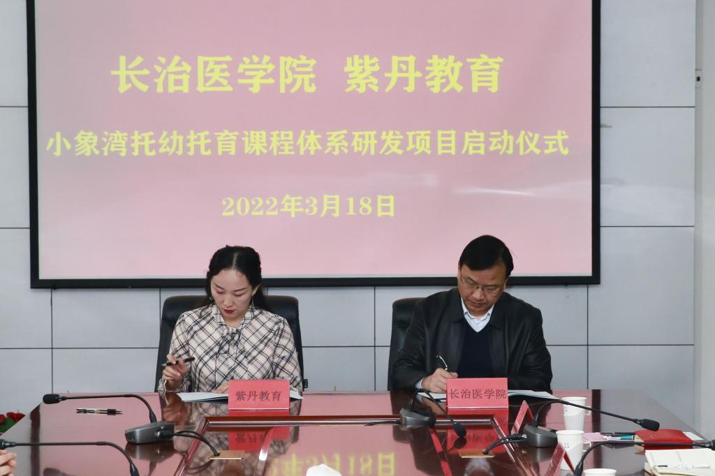 最后,王金胜与党佳佳分别代表长治医学院和紫丹教育集团签署了《小象湾托幼托育课程体系研发项目合作研究协议》。
