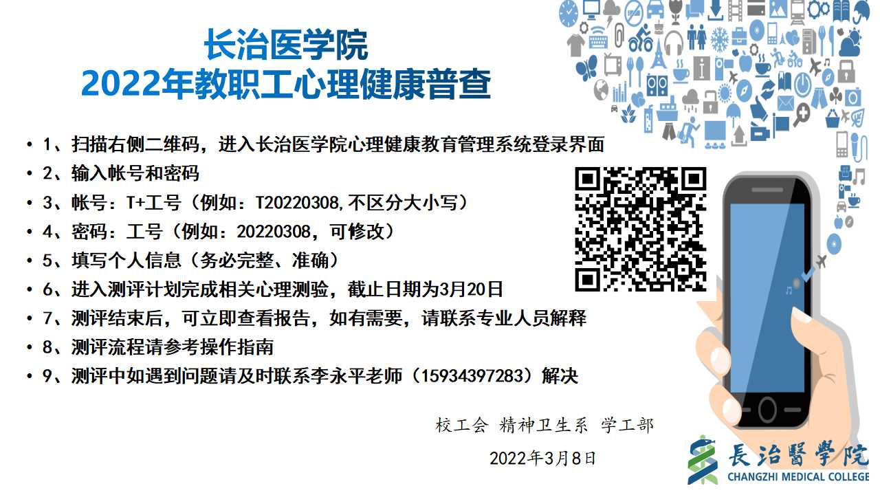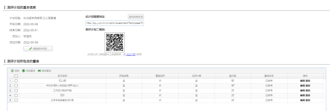 由李永平、许学华和李超老师负责,选取了90项症状自评量表、卡特尔16种人格测验、工作压力自测问卷、抑郁自评量表和总体幸福感量表,教职工通过扫描二维码进行在线测试,并可以及时查看报告,有助于大家更好的认识自己、了解自己、完善自己,为学校有效开展心理健康教育和咨询工作提供科学依据。经过初步分析,有近20%的教职工存在不同程度的心理困扰,未来需要进一步加强教职工的心理关怀和专业支持。