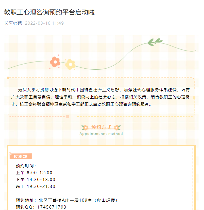 为深入学习贯彻习近平新时代中国特色社会主义思想,加强社会心理服务体系建设,培育广大教职工自尊自信、理性平和、积极向上的社会心态,根据《〈山西省总工会关于建立“职工心理健康咨询基地”的实施方案〉的通知》(晋工办发〔2017〕72号)等文件政策,结合教职工的心理需求,近期,依托我校省级职工心理健康咨询示范基地,校工会联合精神卫生系和学工部组织开展了教职工心理健康咨询系列活动。