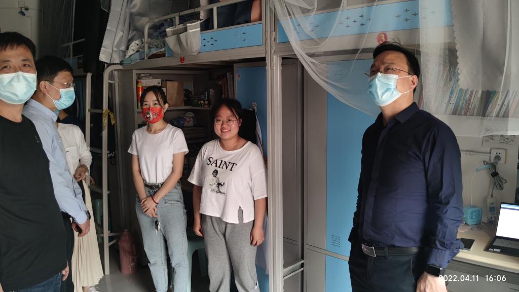 来到学生公寓,王金胜与同学们进行了亲切交谈,仔细询问他们在生活、学习等方面遇到的困难及对学校全封闭管理的意见和建议。王金胜表示,全封闭管理难免会给大家的学习生活带来不便,遇到问题要及时向老师们反映,学校永远是同学们最坚实的后盾,我们会尽最大的努力为同学们创造良好的学习和生活环境。他还叮嘱同学们,要时刻注意个人防护,加强体育锻炼、保持乐观心态,相互配合、共克时艰。