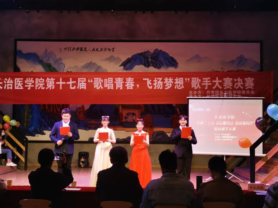 在中国共产主义青年团成立100周年之际,弘扬“五四”精神,让广大青年以更加朝气蓬勃的精神状态投身社会主义事业伟大实践,用优异成绩喜迎二十大胜利召开。4月30号晚上6点由校团委主办、校学生会承办“歌唱青春·飞扬梦想”校园歌手大赛决赛在音疗基地举行。党委组织部副部长赵刚,校团委副书记连静,护理学系团委书记谢冰,基础医学部团委副书记李秀萍,人文艺术系教师路瑶、武艺蕾,第十六届校园歌手大赛一等奖获奖者宇文潇东担任大赛评委。