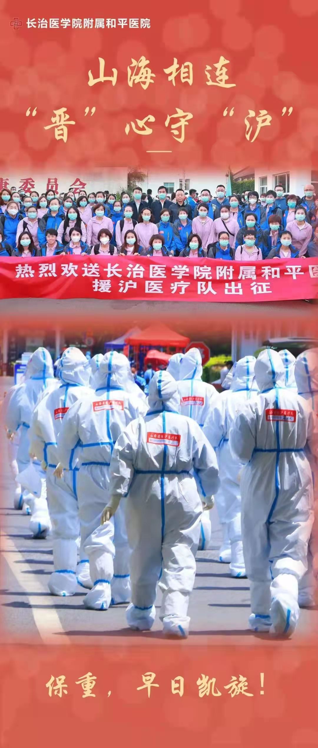 此时此刻,太行山阳光明媚、草木葱郁、生机勃发,上党大地春风和畅、国泰民安、欢乐祥和。当上海的新冠肺炎疫情肆虐,你们再一次白衣为甲、逆行出征,展现了当代中国青年的担当精神,体现了长医红色基因和精神传承,我为你们感到骄傲!