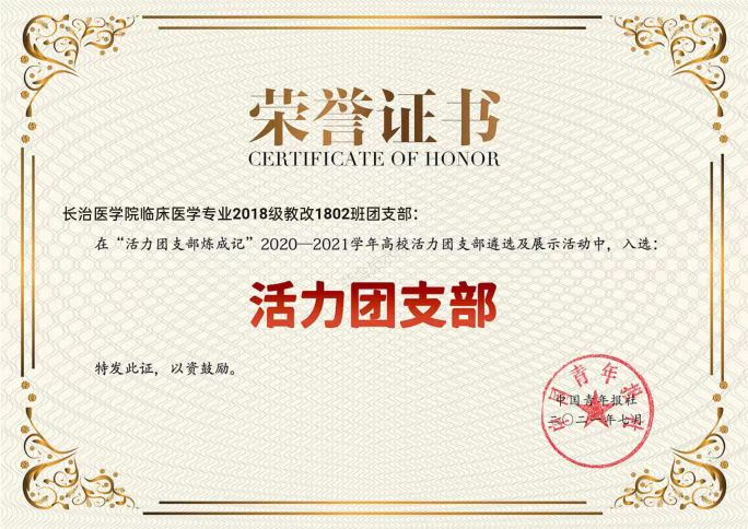 日前,由山西省人力资源和社会保障厅、共青团山西省委联合开展的“山西省五四红旗团委(团支部)、山西省优秀共青团员、山西省优秀共青团干部”评选表彰活动落下帷幕,在经过诸多遴选环节后,我校第一临床学院教改1802班团支部最终以优异的表现,入选为“山西省五四红旗团支部”这是我校教改1802班获得“2020-2021学年全国高校活力团支部”荣誉称号后的又一殊荣。