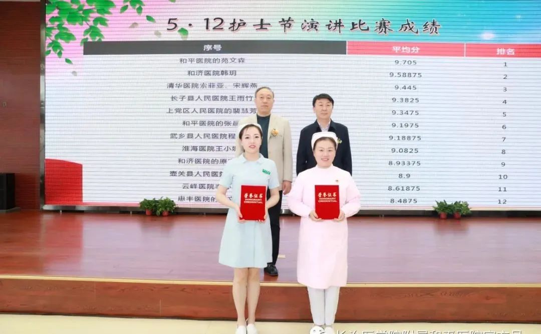 为增强集团各成员单位凝聚力,共同促进护理事业健康发展,5月10日,和平医疗集团举办首届“5.12”国际护士节演讲比赛暨表彰大会。长治医学院医管处处长牛庆国,和平医疗集团理事长、和平医院党委书记尚进平,和济医院党委书记李永红,和平医院院长李红倬等集团成员单位领导出席会议,优秀护士长、优秀护士代表参加会议。