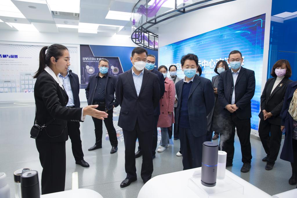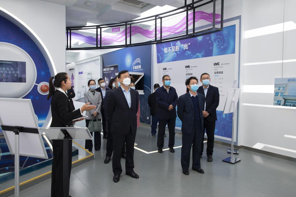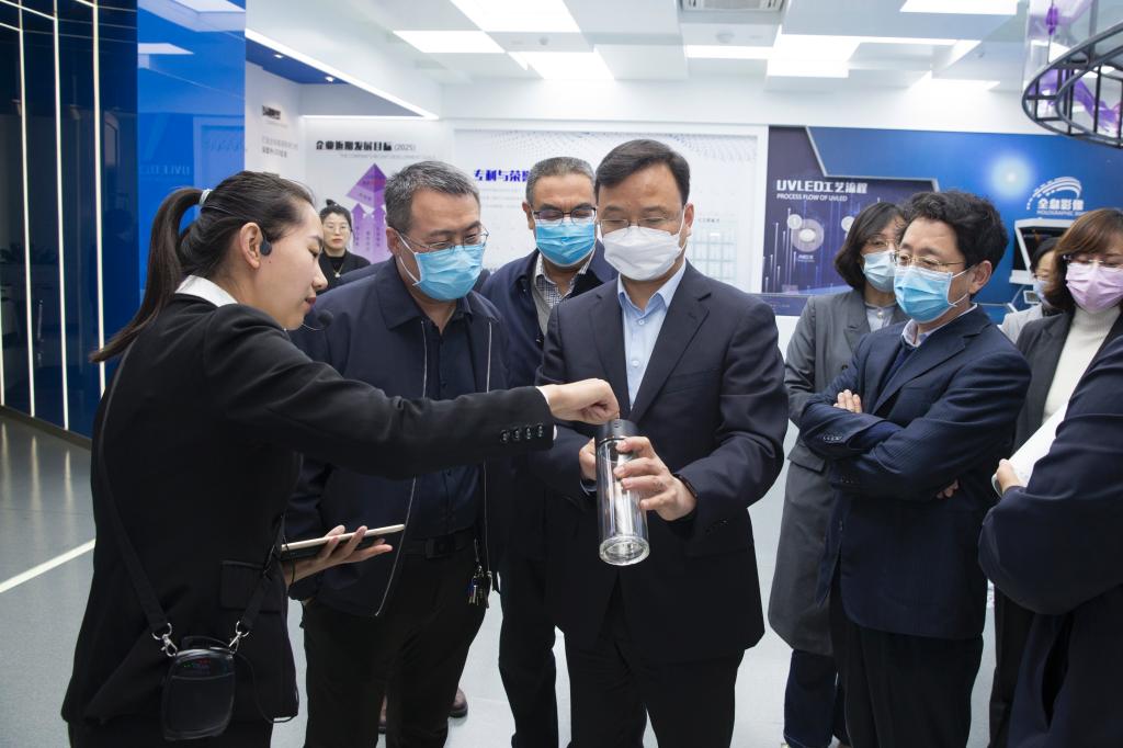 山西中科潞安紫外光电科技有限公司是山西省第三代半导体紫外光电工程研究中心。王金胜一行先后参观了中科潞安一楼展厅、生产车间,听取了公司负责人关于公司发展现状、生产工艺流程、产品应用、发展前景等情况的介绍;观摩了公司在深紫外产品研发、转型升级、创新发展等方面取得的成绩。
