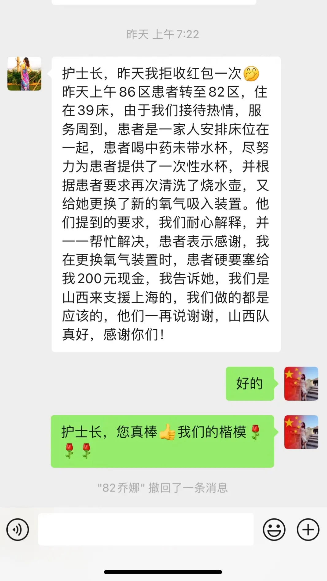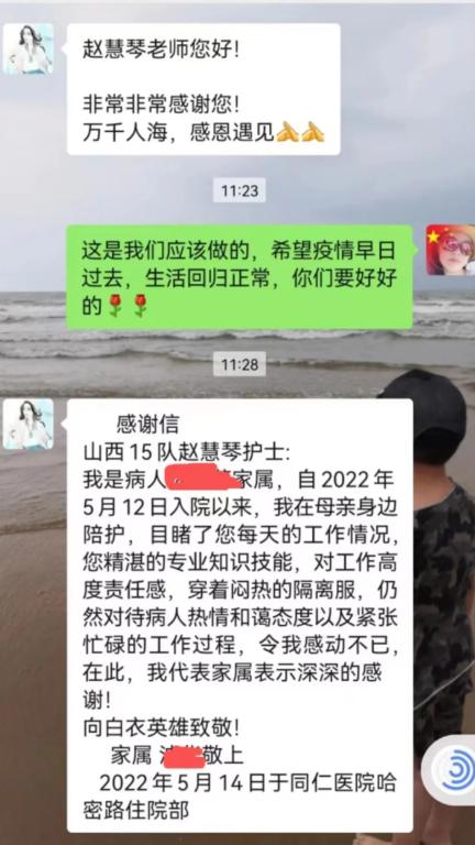 一个微笑可以拉近距离,一个动作可以温暖人心,大家携手抗疫、传递温暖,用专业护理技术帮助因卧床过久造成皮肤多处压力性损伤的老奶奶,家属送来了感谢信;照护患者不分国界,心理辅导消除焦虑,国际友人发来了电子祝福卡;体贴入微关爱患者,拒收红包感动家属,亲人传来了电子致谢信。他们把初心写在行动上,把使命担在职责上,用点点微光周到服务、守“沪”生命,竭“晋”全力、守“沪”安宁,收获了满满的真心真情。