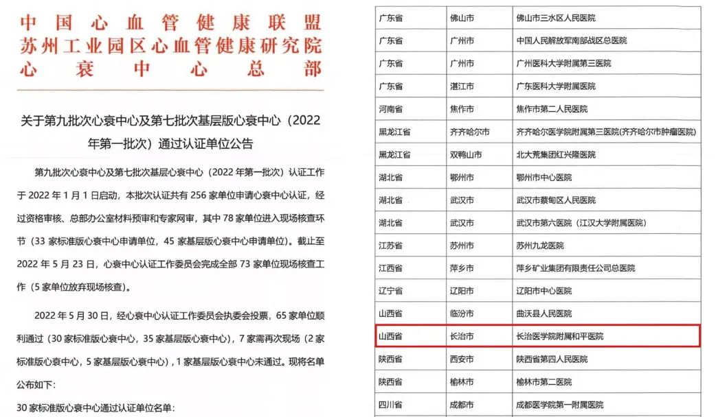 5月30日,中国心衰中心总部发布了《关于第九批次心衰中心及第七批次基层心衰中心(2022年第一批次)通过认证单位公告》,附属和平医院心衰中心一次性通过认证,成为中国标准版心衰中心,这标志着附属和平医院心衰中心建设水平已迈入国家行列。
